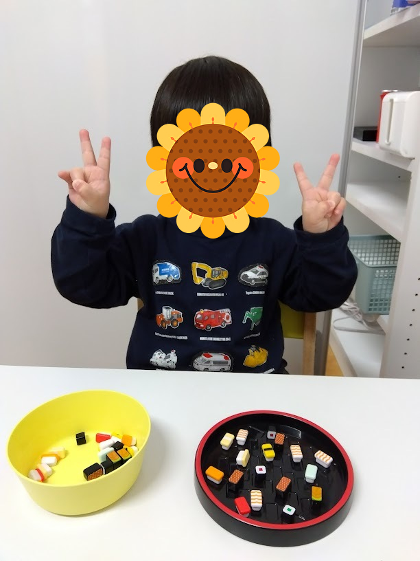 写真の課題では『まめ寿司』というとっても小さなお寿司を箸でつまむ教材を使用しています。