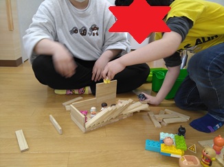 ブロックでフィールドを作りその中に手作りのコマを回し、どちらが長く回せるか対決をしていました😲