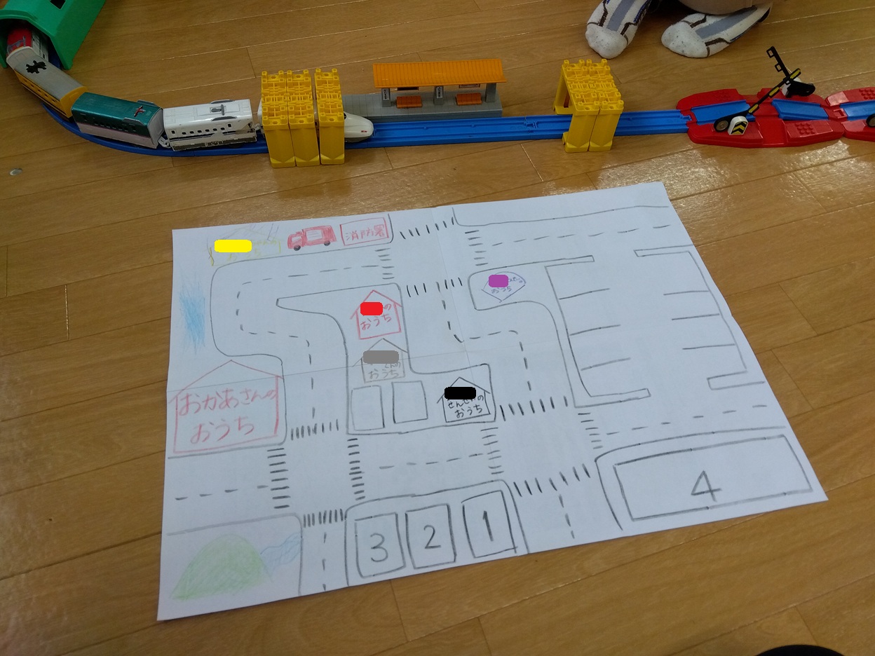 この日は、職員とお子さんでA4用紙を4枚繋げた紙に手作りマップを作りました!