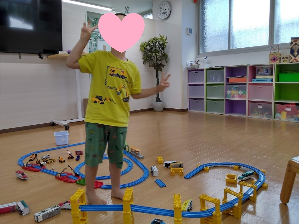 こちらの写真は線路を作っている途中のお写真で、上手く線路が合わないと試行錯誤しながら「ここは真っ直ぐかなぁ」「ここ繋がらないなぁ」と考えたり、お友達同士で協力して完成させています🤓