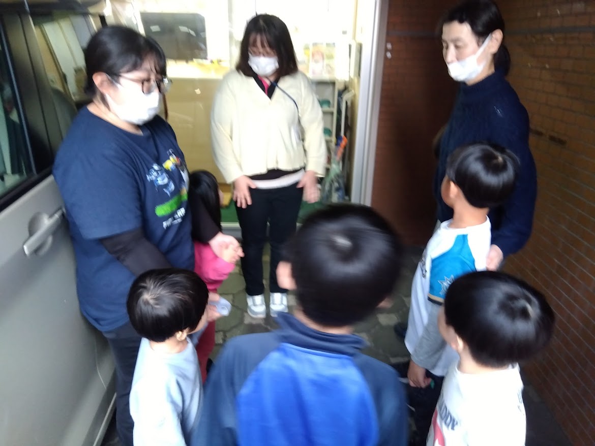 地震の避難訓練で地震が来た時にどのように身体を守るのかを伝えて頭を手で覆いダンゴムシのように丸くなっていました。