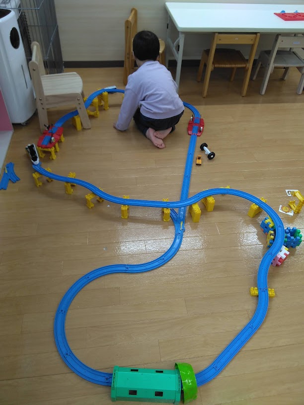 二人で話し合って「今日はプラレールで高速道路みたいなのを作ろう!」と一緒に遊ぶものが決まった模様。