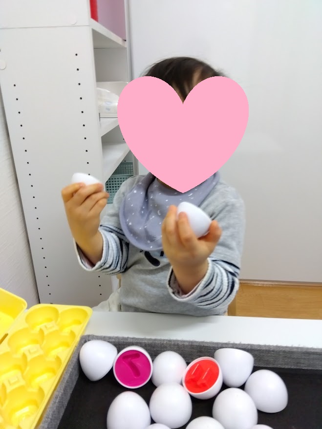 卵を割る・はめることで指先の筋力アップや形を想像する力など養うことが出来ていますよ🤓