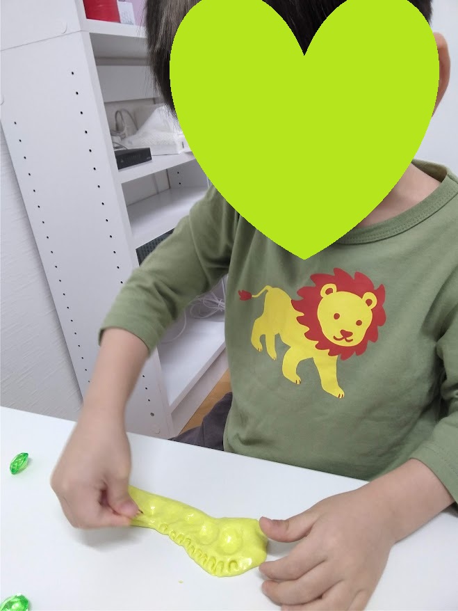 少し硬めの素材なのですが、手の平を使って伸ばしたり指先を使ってちぎったりして楽しみながら取り組んでいますよ😆