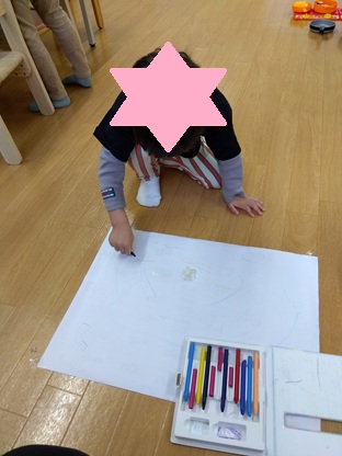 この日は、床に貼った大きな紙にお絵描きをして遊びました!