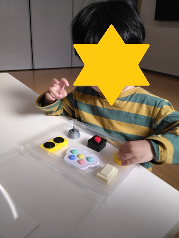 こちらのお子さんが使っているおもちゃは、スイッチやボタンを組み合わせて作ったものになります。