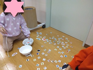 『割りばし』と『マグネットシート』を組み合わせて作った釣り竿で魚釣りをして遊んでいるお子さんたち。