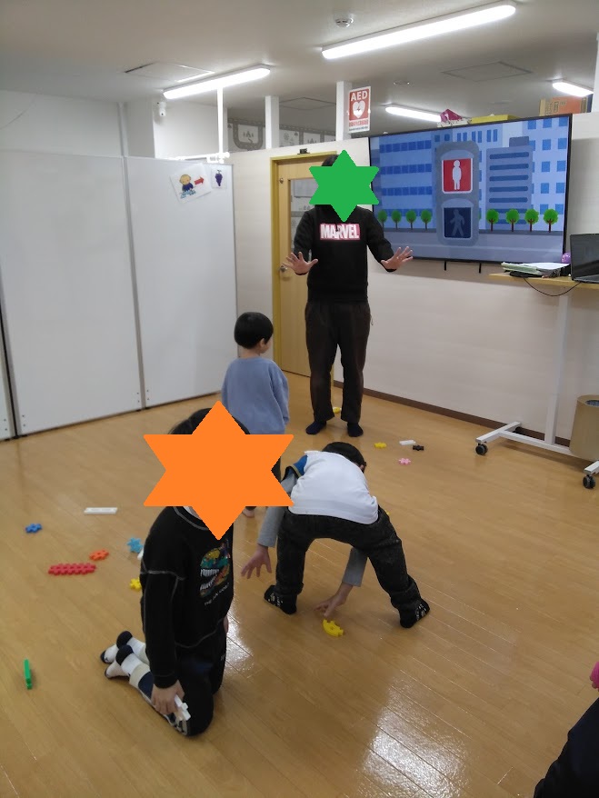 ストップゲームを行い信号が青の時は歩いて散らばっているブロックを拾いかごに入れて、赤になると止まるルールです。青のときはみんな動いていますが、赤に変わった瞬間きつい体勢になりながらも頑張って止まっていました👍
